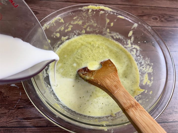 7. 6をボウルに移し、牛乳を加え混ぜたら冷蔵庫でよく冷やします。