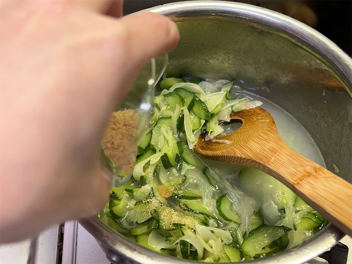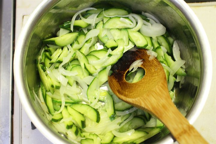 3. 玉ねぎがしんなりしたら、きゅうりを加えてさらに炒めます。きゅうりもしんなりして、透明感が出るまで炒めます。バターでしっかり炒めることできゅうり独特の青臭さがなくなるんですって!