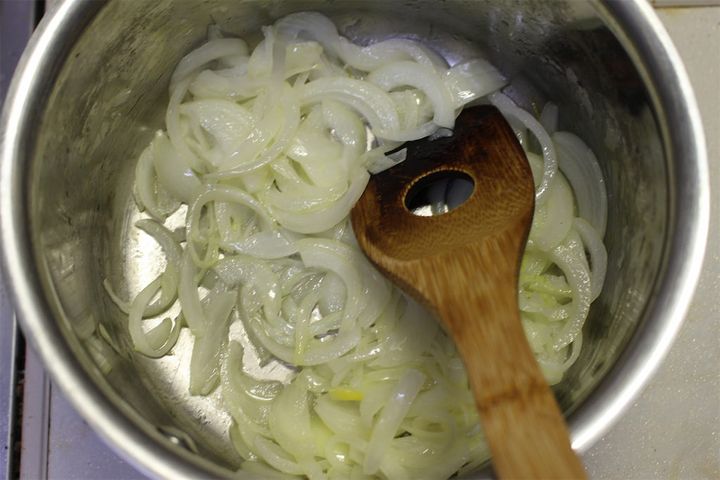 2. ここで下ごしらえのカギとなる食材…バターの登場! 鍋にバターを入れ、弱火で玉ねぎをじっくり炒めます。しんなりするくらいが目安。しっかりと炒めることで、まずは玉ねぎの甘みを引き出しましょう。