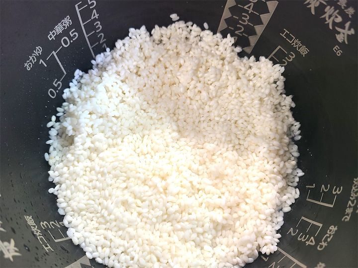 1. 白米を軽く洗って水を切り、炊飯器に入れます。