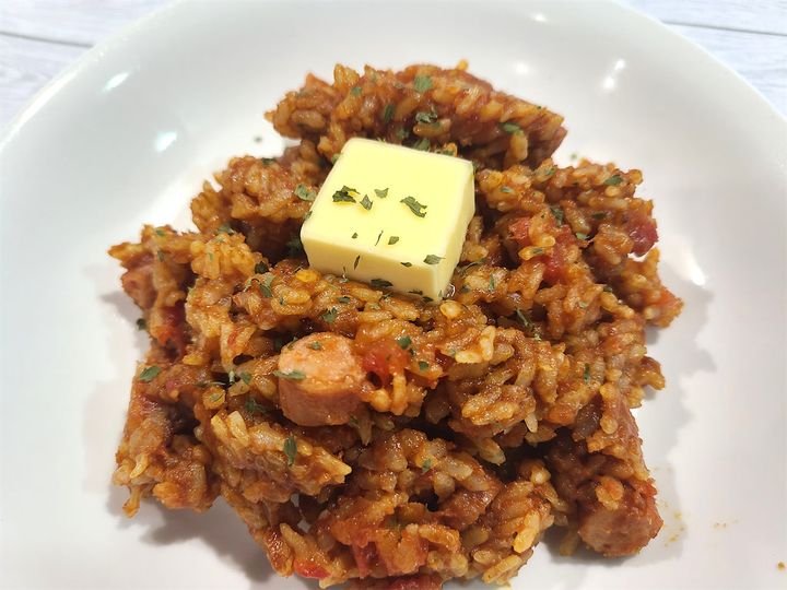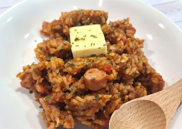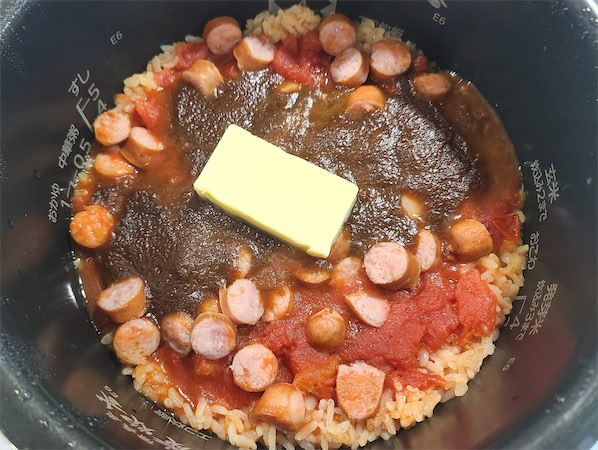 トマトの酸味もバターのコクとウインナーの旨味でまろやかになり、食べ応え十分。鶏肉やひき肉に変えてもおいしそうだし、ケチャップを使えばチキンライス風にも。オムライスのベースにも使えそうです。