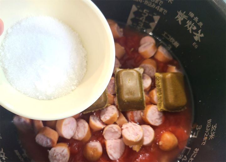 4. 最後にカレールウと砂糖を上からかけて、炊飯器の「炊き込みモード」で炊飯します。