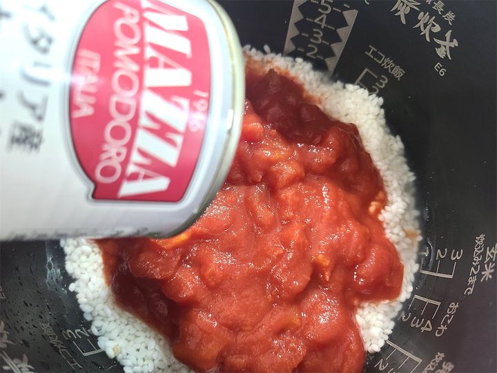2. 水、トマト缶の順番で入れます。このとき混ぜないようにしましょう。
