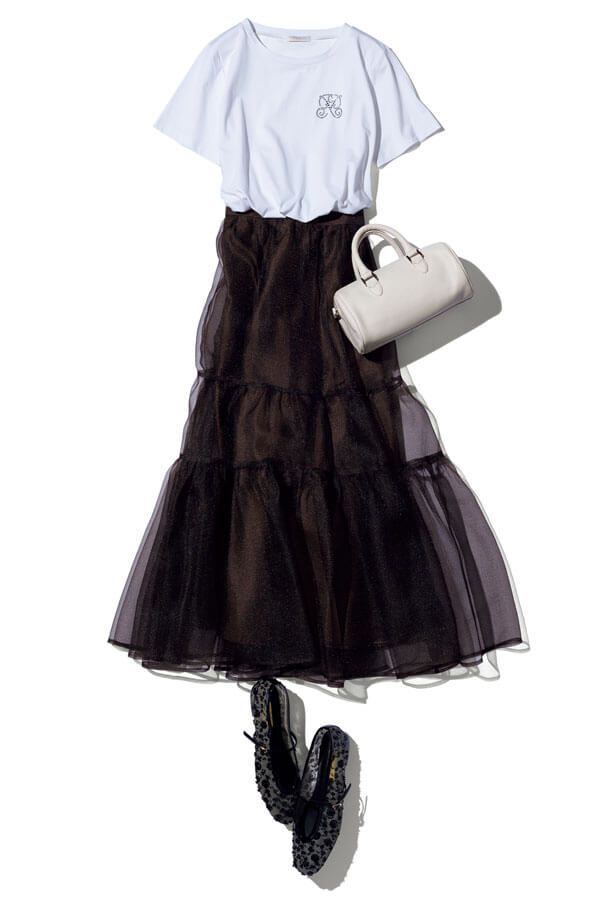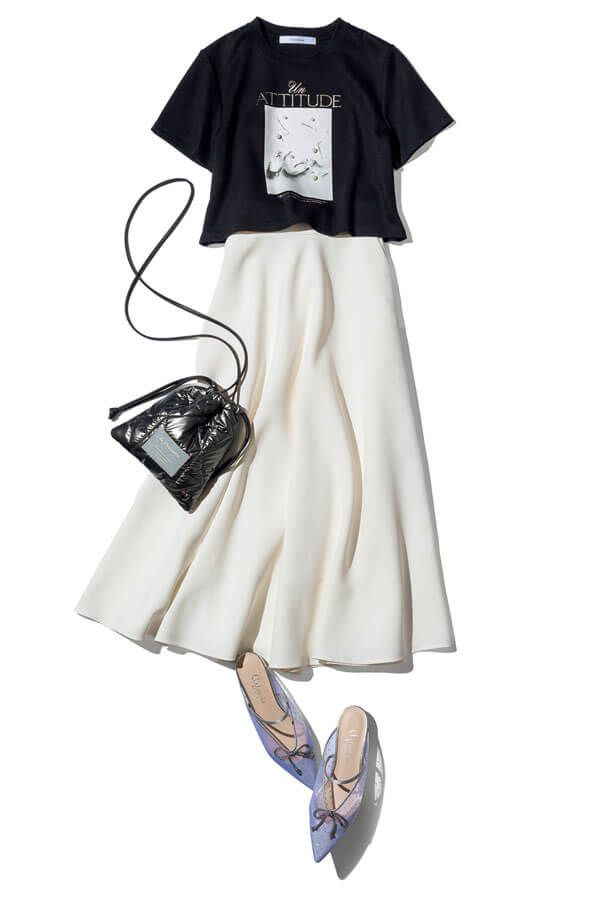 Tシャツ¥12,100/リランドチュール スカート¥24,970/ハッシュニュアンス(オンワード樫山 お客様相談室) バッグ¥4,400/&シュエット(& シュエットギャラリー 池袋サンシャインシティアルパ店) 靴¥11,550/アルテミス by ダイアナ(アルテミス by ダイアナ アーバンドック ららぽーと豊洲店)