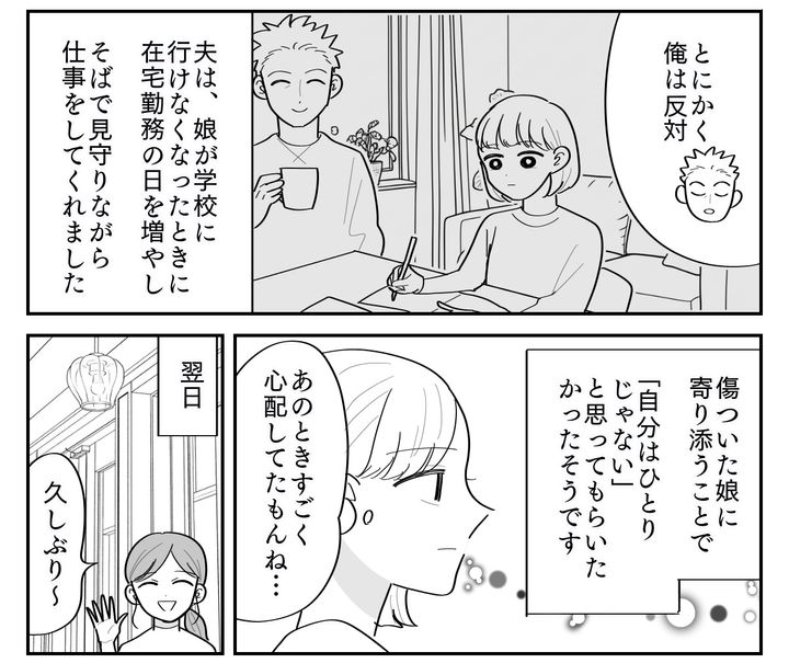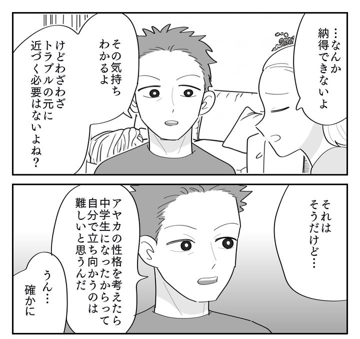娘はおとなしく、理不尽なことも黙って耐えてしまうタイプ。夫はイヤがらせに苦しむ娘に心を痛め、懸命に寄り添っていました。夫の言うことも一理ある……。数日後、私はいつも相談にのってくれる先輩ママのシマヅさんに会いました。