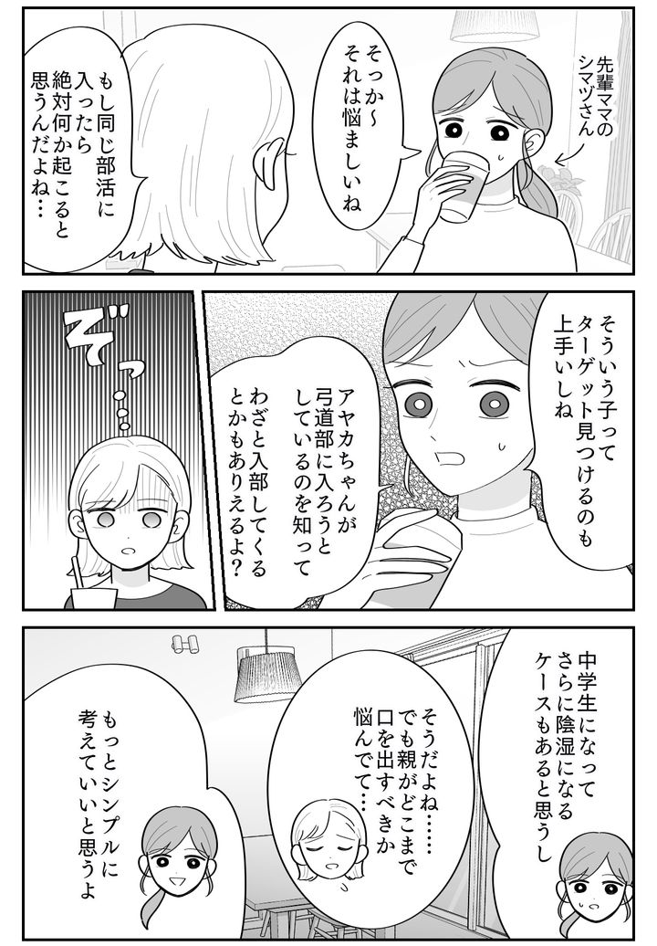 私(チカ)は夫と、中学に入学したばかりの娘(アヤカ)との3人暮らし。娘は小学5年生のときにミトちゃんたち3人組からイヤがらせに遭い、一時期は学校へ行けなくなったほどでした。幸いクラスが離れた6年生の頃には元気になり、この春からは中学校生活も楽しみはじめています。今は部活見学の期間で、娘は弓道部に興味を持ちました。しかしミトちゃんたち3人組がそろって入部するらしく……。夫は「やめた方がいい」という意見のようです。
