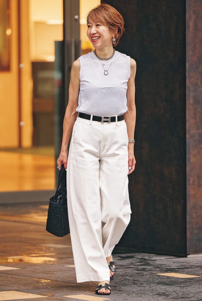 【60代お手本スナップ】夏のホワイトコーデがぼやけないようにするには?小物を黒でまとめればメリハリのある辛口の装いに!