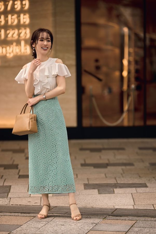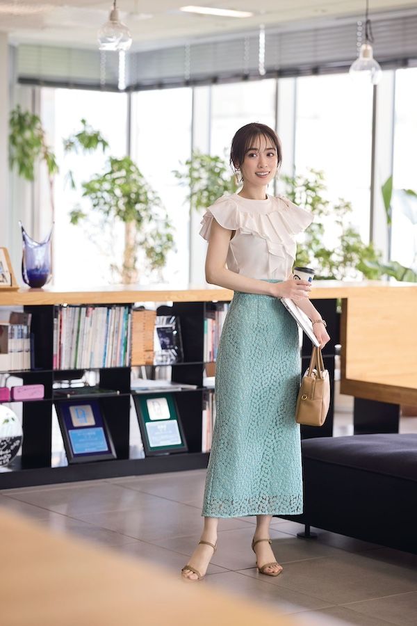 オフィスではフリルでエレガントに着こなしつつ、肌見せは控えてきちんと感を優先。