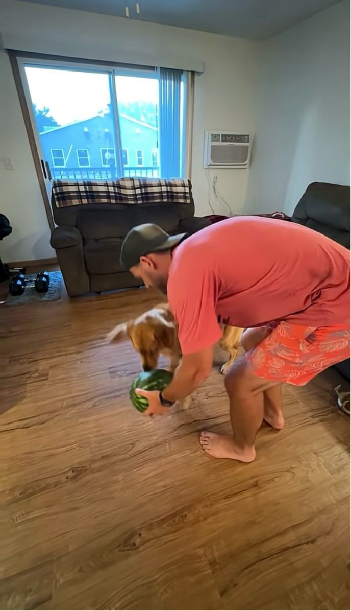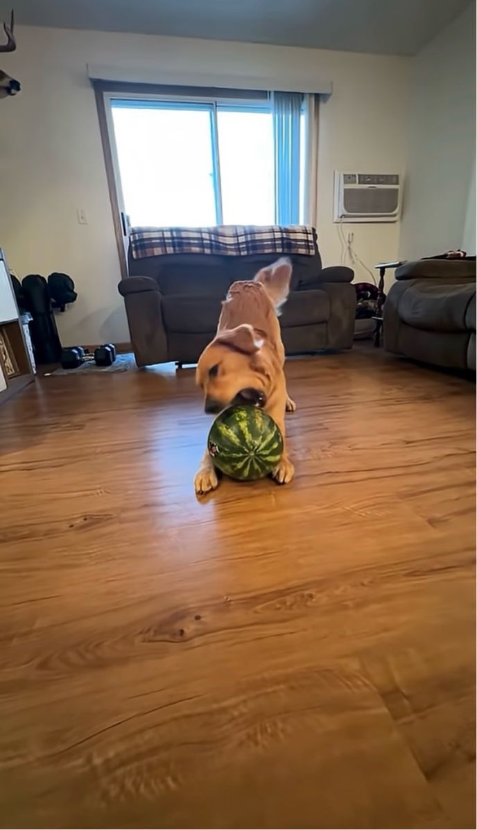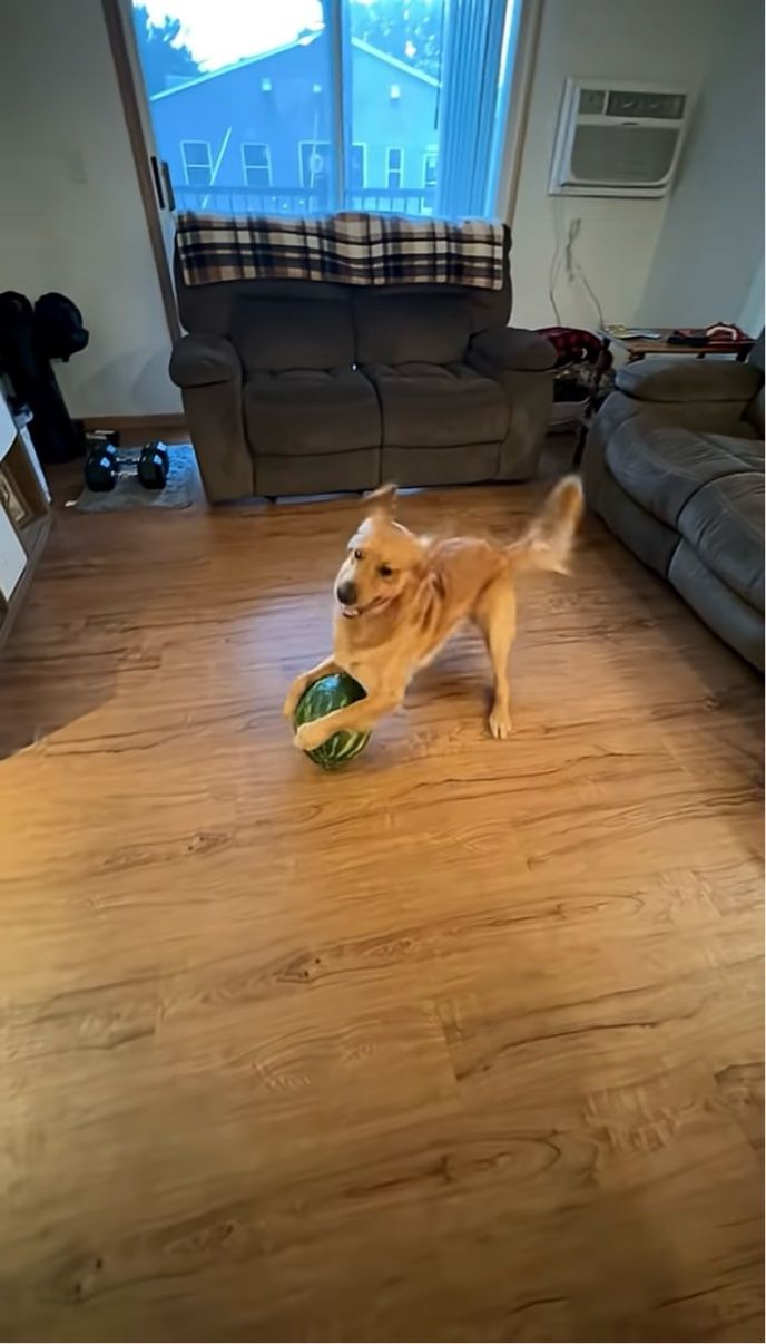 飼い主さんから大好きなスイカをもらったゴールデンレトリバー。 踊り跳ねるように喜んでいました!!