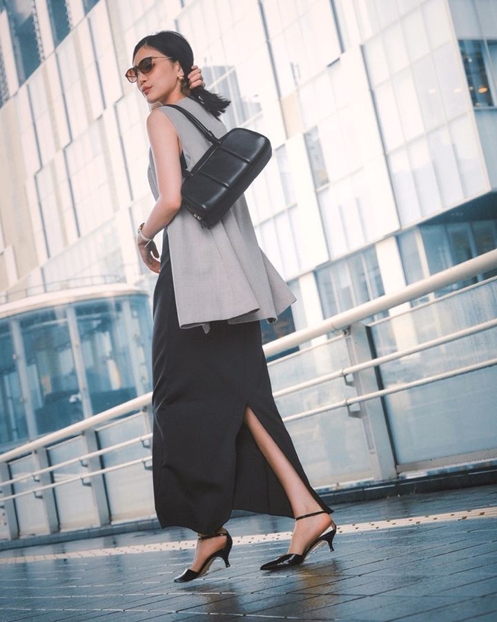 8月5日(火)、バックスリット入りの黒スカートが歩くたびに揺れて、抜け感と女っぽさを演出。グレーのジレを主役にしたIラインシルエットで、都会的なムードに仕上げて。ストラップヒールで足元は繊細に、大人の色気もひとさじ。肌に馴染む茶フレームのサングラスなら、通勤コーデにも自然にマッチします。