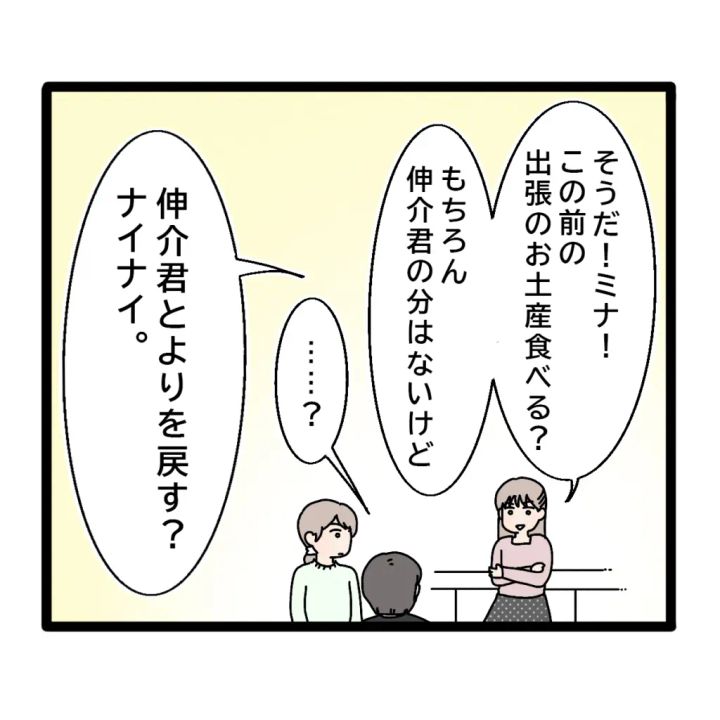 その後、「そうだ!ミナ!この前の出張のお土産食べる?もちろん伸介くんの分はないけど」そう言った後、「伸介くんとよりを戻す?ナイナイ」まくしたてるお姉ちゃんに伸介も訳がわからないでいると、