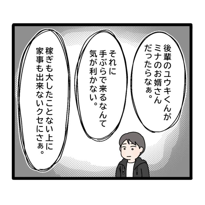「後輩のユウキくんがミナのお婿さんだったらなぁ。それに手ぶらで来るなんて気が利かない。稼ぎも大したことない上に、家事も出来ないなんてさぁ」とお姉ちゃんが伸介に言いたい放題!