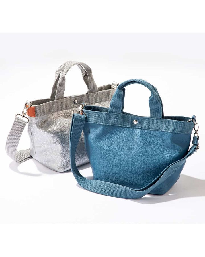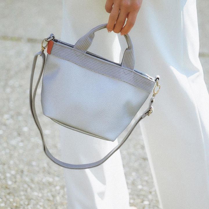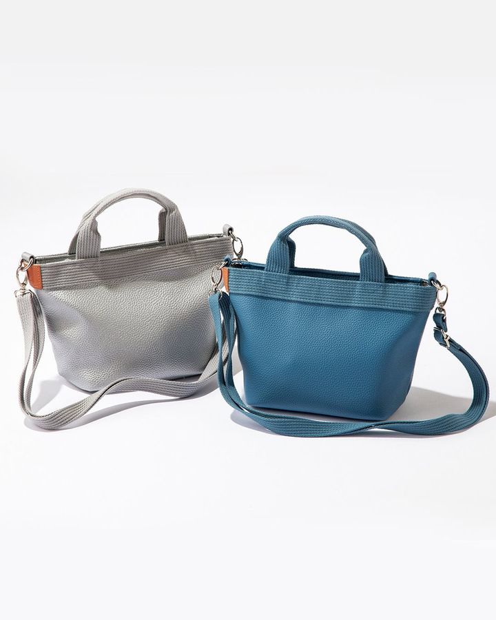 コーデに映える鮮やかなカラーと、本革のようなシボ感がしっかり高見え。ミニサイズは長財布も入る内ポケットやペットボトルホルダーなど細かい仕切りが整理収納に一役。