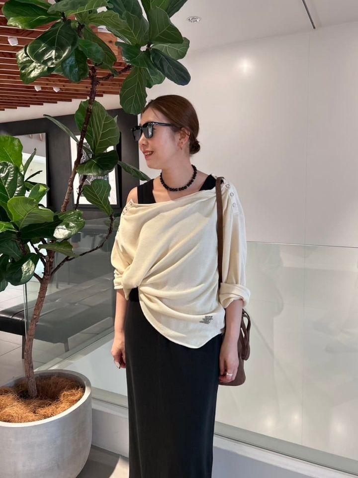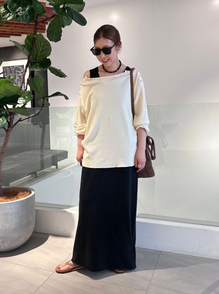 「タイトなマキシワンピースにJANE SMITHの別注プルオーバーを重ね、肩のボタンを開けてラフなヌケ感をプラス。ほどよい肌見せバランスで大人のルーズレイヤードスタイルに挑戦してみました」
