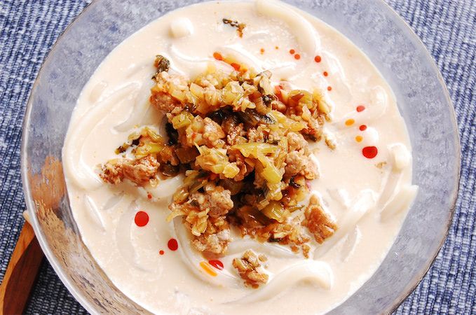 冷凍うどんをちょっとリッチに仕立てるおしゃレシピを日本の中国料理をけん引する麺大好きシェフ、脇屋友詞さんのYouTubeチャンネルで見つけました。マヨネーズや練りゴマなどを混ぜた「豆乳ダレ」と、酢の酸味を加えた「肉みそ醤」を組み合わせた「冷やし豆乳担々麺」です。肉みそ醤の酢と豆乳に含まれるたんぱく質が反応して、豆乳にとろみがつき、麺とも絡みやすくなるそうですよ。