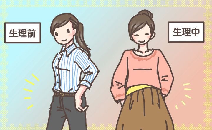 もし早めに生理がきてしまった場合、ボトムスが汚れてしまっても目立たないようにするためです。また、ジーンズも圧迫感があるので、生理前は避けています。