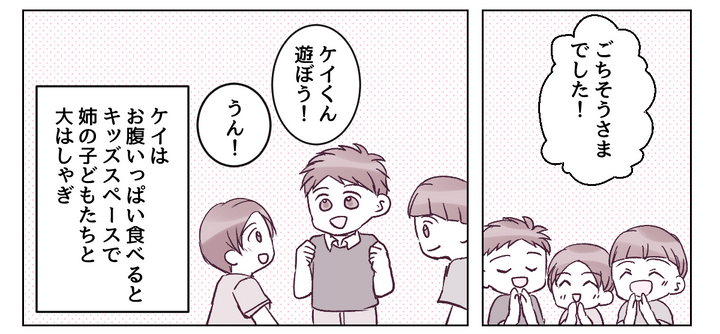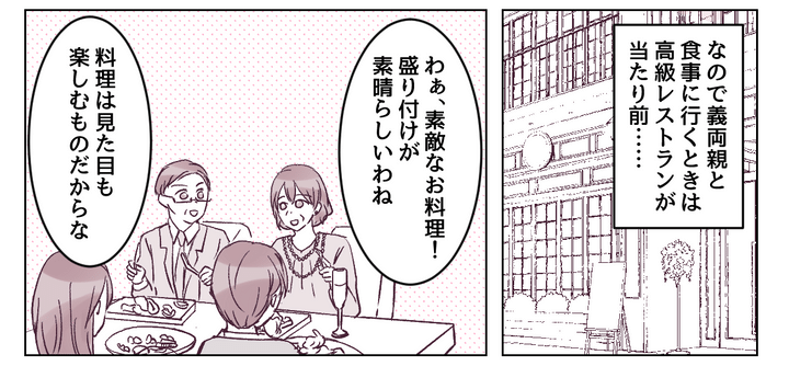 義両親と食事に行くときは、高級レストランが当たり前。ケイはお行儀よく振る舞うようしつけられるし、俺は引け目を感じてひたすら萎縮していたのでした。しかし地元に帰省してみると、姉に案内されたのはブッフェ式レストランで……。