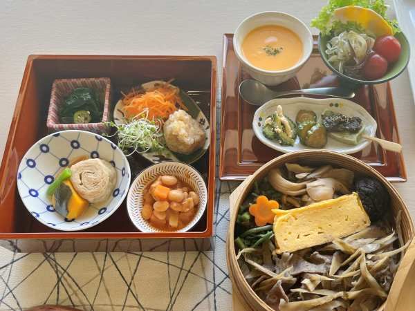 せいろの蓋を開けると湯気とともに色とりどりの食材。お米は栃木県産コシヒカリ。せいろで蒸しているから粒がたってふんわり食感です。 2段のお膳はモロヘイヤ、コリンキー、ゴーヤ、オクラ、トマトなどなど地元産の夏野菜がふんだんに使われていて一つ一つが丁寧で手が込んだお料理。野菜中心でヘルシーかつ美味しい!