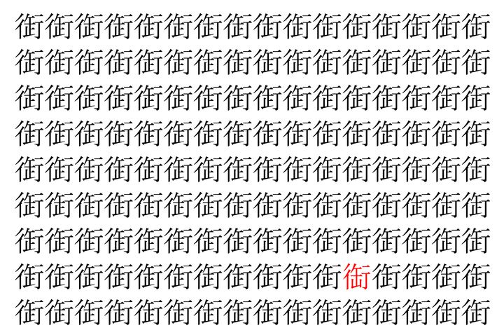 画像の中には、「衘」という漢字が縦に9行、横に16個並んでいます。 全部で144個となりますが・・・、そのうち1つは「異なる漢字」となってますよ!!