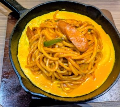 定番の鉄板ナポリタン、熱々の鉄板の上にふわふわたまごとトマトソースの酸味が効いたナポリタンは、人気の一品です。