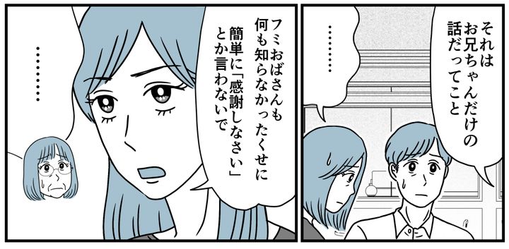 フミおばさんは絶句しています。全く知らなかったのでしょう。義母が子どもたちを置いて彼氏と外泊していたことも、大学の費用を一銭も払っていないことも……。「女手ひとつで必死で大学まで出してあげた」という義母の大嘘を信じていたのです。