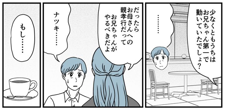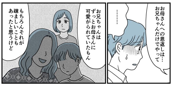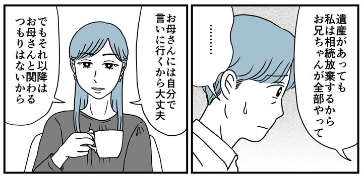 「お母さんへの親孝行だって、お兄ちゃんがやるべきだよ。もし遺産があっても、私は相続放棄するから。もうお兄ちゃんが全部やって」アツシは何も言いませんでした。きっと「何も言えなかった」のでしょう。重苦しい空気が流れます。