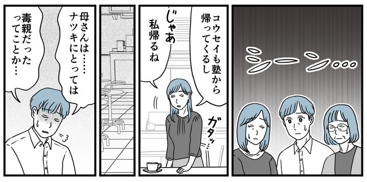 ナツキさんにとって、本当に辛く苦しい日々だったことでしょう。まさかあの義母がそんな毒親だったなんて……。けれど今になってみれば思い当たる節がありました。義母の言葉が、どこかナツキさんを軽視しているように感じる場面があったのです。しかしナツキさん自身が軽く流していたし、私もそこまで深く気に留めることはありませんでした。