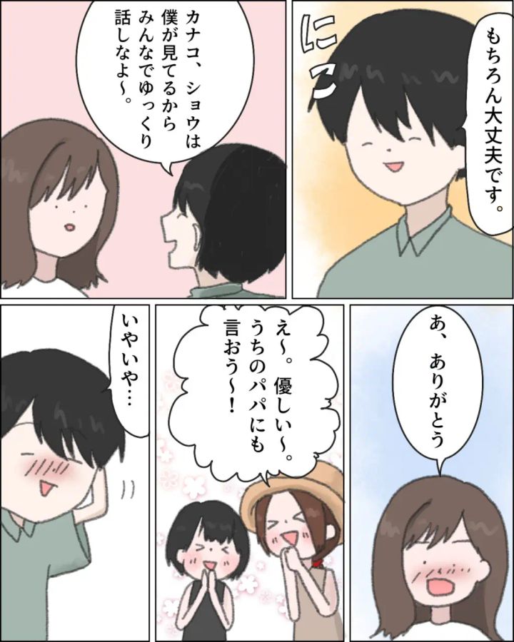 すると、「もちろん大丈夫です」そう言ってにっこり笑うユウタ。そして、「カナコ、ショウは僕が見てるから、みんなでゆっくり話しなよ~」と私に言い、思わず「あ、ありがとう」と言いながら赤面!すると、「え~。優しい~。うちのパパにも言おう~!」とママ友たちに絶賛され「いやいや・・」と照れながらも上機嫌なユウタ。