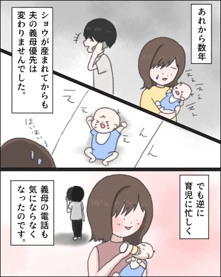 あれから数年が経ち、息子のショウが産まれてからも、ユウタの義母優先は変わりませんでした。でも、逆に育児に忙しく、私は義母の電話が気にならなくなっていきました。