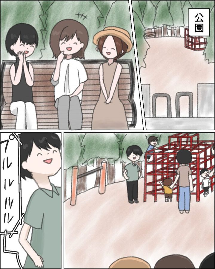 久しぶりに、ママ達だけでゆっくりおしゃべり。楽しくて盛り上がっている頃、ユウタはジャングルジムで遊ぶ子ども達を見ていました。すると、プルルルルとスマホの音が。