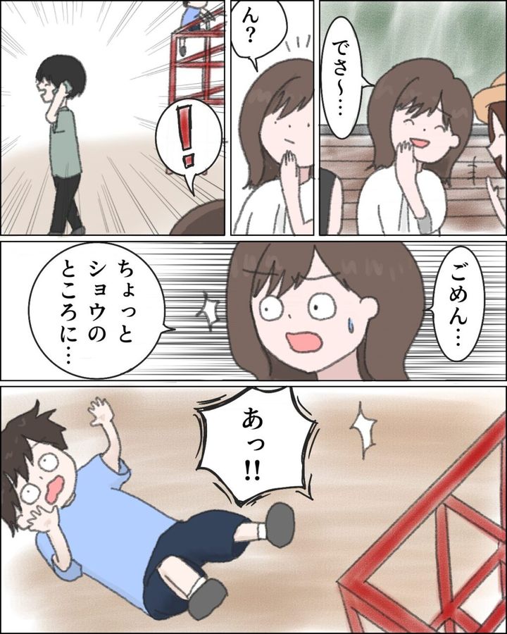 あれから数年が経ち、ショウくんが産まれてからも、ユウタさんの義母優先は変わりませんでした。でも、育児に忙しく、次第に義母の電話も気にならなくなったカナコさん。そして、ショウくんの運動会が終わった後、ママ友達に誘われて公園へ行くことに。一緒に誘われたユウタさんは、「子ども達を見てるから、ゆっくり話しなよ」と言ってくれて思わず赤面。安心して公園のベンチでママ友トークをしていると、スマホ片手に子ども達から離れていくユウタさんの姿を見て、びっくりしたカナコさん、すると、ショウくんがジャングルジムから・・!もうユウタさんのことを信じられなくなってしまいますよね。