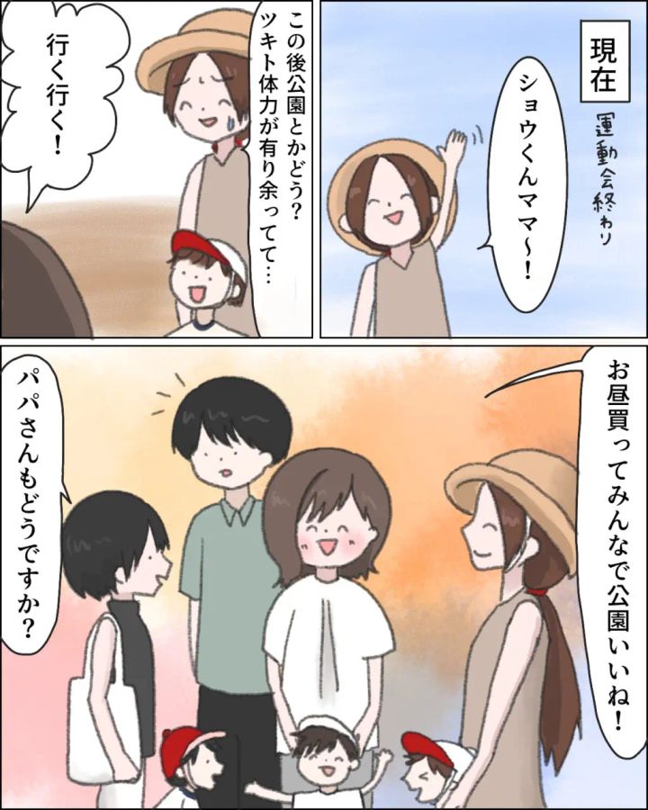 運動会が終わった後、「ショウくんママ~!」ママ友に呼ばれ、「この後公園とかどう?ツキト、体力が有り余ってて・・」と誘われ、「行く行く!」と即OK!「お昼買ってみんなで公園いいね!」と話していると、「パパさんもどうですか?」ともう一人のママ友がたずねました。