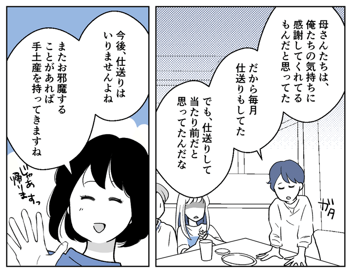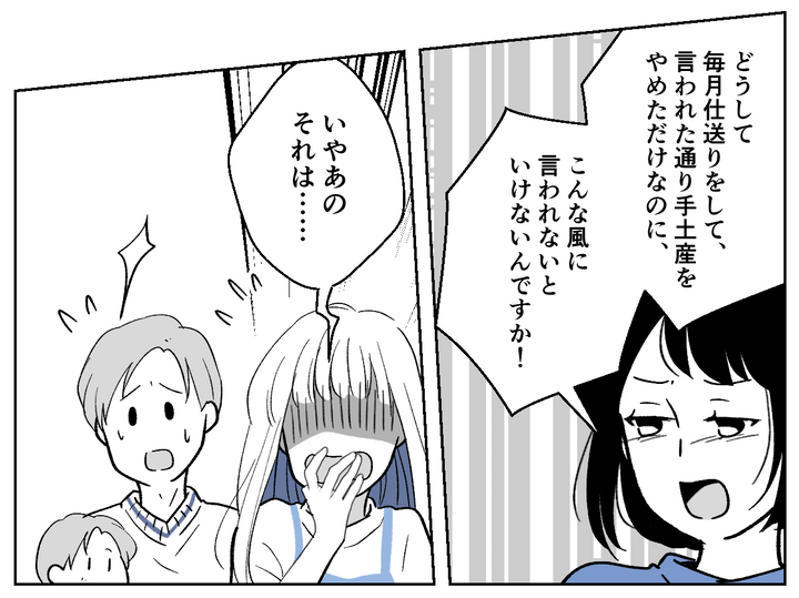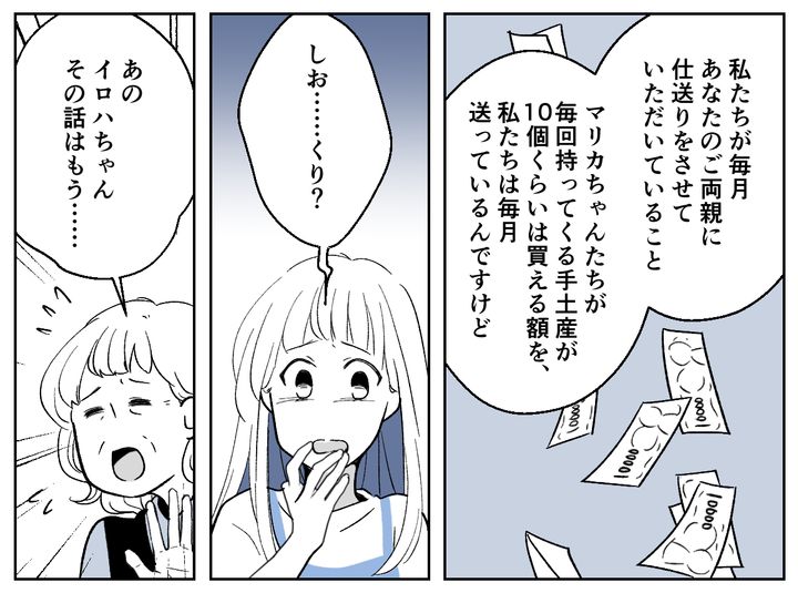 酔っぱらったマリカちゃんに「不公平だ」と責められ、私は「毎月仕送りしている」と反論してみることに。どうやらマリカちゃんたちは仕送りを知らなかったようで、言葉を失っていました。