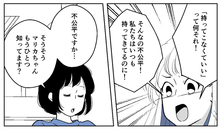 「義両親から手土産を持ってこなくていいと言われた」と説明すると、マリカちゃんは声を荒げました。