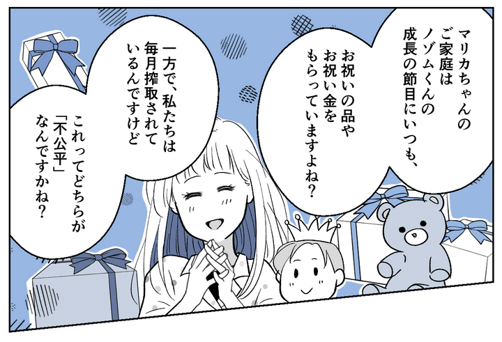 私たちが毎月3万円を搾取されているのに、マリカちゃんのところはノゾムくんの成長の節目にプレゼントやお金をもらっているのです。これが不公平ではなく何なのでしょうか。