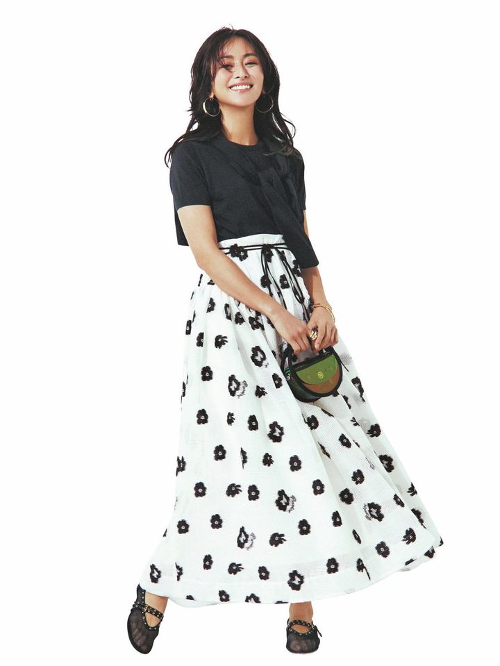 スカート¥25,300(ELENDEEK)ニット¥16,500(マノフ/クラネデザイン)バッグ¥8,800(カカトゥ/アンビリオン)サンダル¥15,950(ダイアナ/ダイアナ 銀座本店)ネックレス¥410,300(ウノアエレ/ウノアエレ ジャパン)