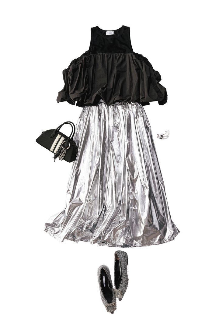 衣装を纏うように遊び心たっぷり&気持ちのアガるコーデで魅了。モノトーンコーデにすることで煌びやかでありながら大人っぽさもある印象に。動くたびに表情を変えるメタリックなシルバースカートが今っぽい。