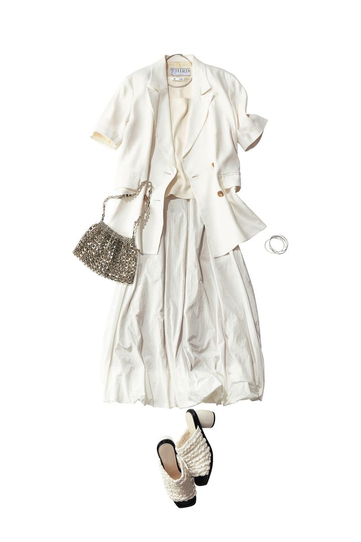 スカート¥28,500(シーニュ)ブラウス ¥18,700 (エミ/エミニュウマン新宿店) バッグ¥6,930 (カシュカシュ/アンビリオン) フラットシューズ¥46,200 (PIPPICHIC/・ベイジュ) ブレスレット¥37,400(ワンエーアールバイウノアエレ・ウノアエレレジャパン)