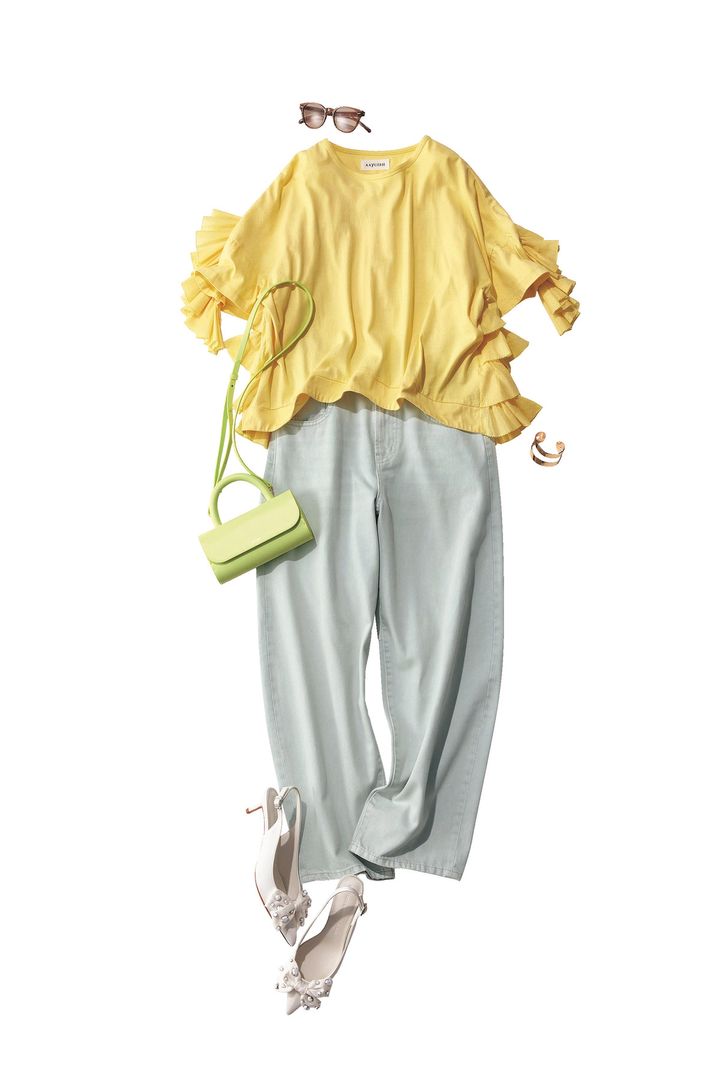 カットソー¥24,200 (アユーシ/エヌディシージャパン東京オフィス)デニムパンツ¥20,800 (アルベージュストーリーオリジナル) バッグ¥78,100 (サルチェ/フラッパーズ) パンプス¥32,900 (ツル バイ マリコオイカワ) サングラス¥47,300 (アイヴァン/アイヴアン東京ギャラリー) バングル¥4,400 (アビステ)