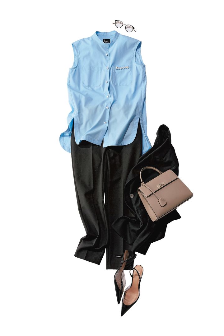 シャツ¥52,800(ヒュー・デイ・トゥ・イブニング)パンツ¥9,990(プラステ)ジャケット¥42,900(マルティニーク/マルティニーク ルミネ横浜)バッグ¥253,000(ボナベンチュラ/ボナベンチュラ カスタマーサポート)パンプス¥9,990(MANGO)メガネ¥48,400(アイヴァン/アイヴァン 東京ギャラリー)