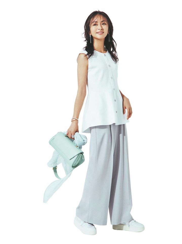 涼しげなペプラムの淡色コーデは蒸し暑い季節でも爽やかな印象を与えてくれます。サラッとした素材は寒色との相性も良くて◎。コンサバの中にもスニーカーといったカジュアルなものを取り入れて親しみやすさをプラス。