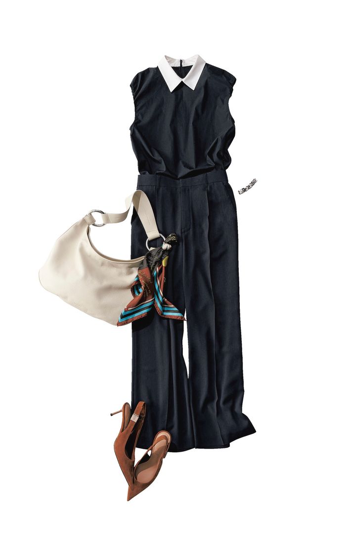 ネイビーブラウス¥22,000(マルティニーク/マルティニーク ルミネ横浜)ネイビーパンツ¥20,900(ティアラ)バッグ¥198,000(J&M デヴィッドソン/J&M デヴィッドソン カスタマーセンター)スカーフ¥16,500(マニプリ)パンプス¥14,900(チャールズ&キース/チャールズ&キース ジャパン)ブレスレット¥132,000(ウノアエレシルバーコレクション/ウノアエレ ジャパン)
