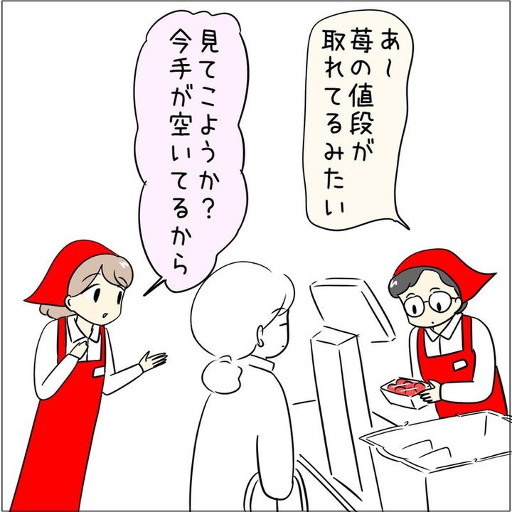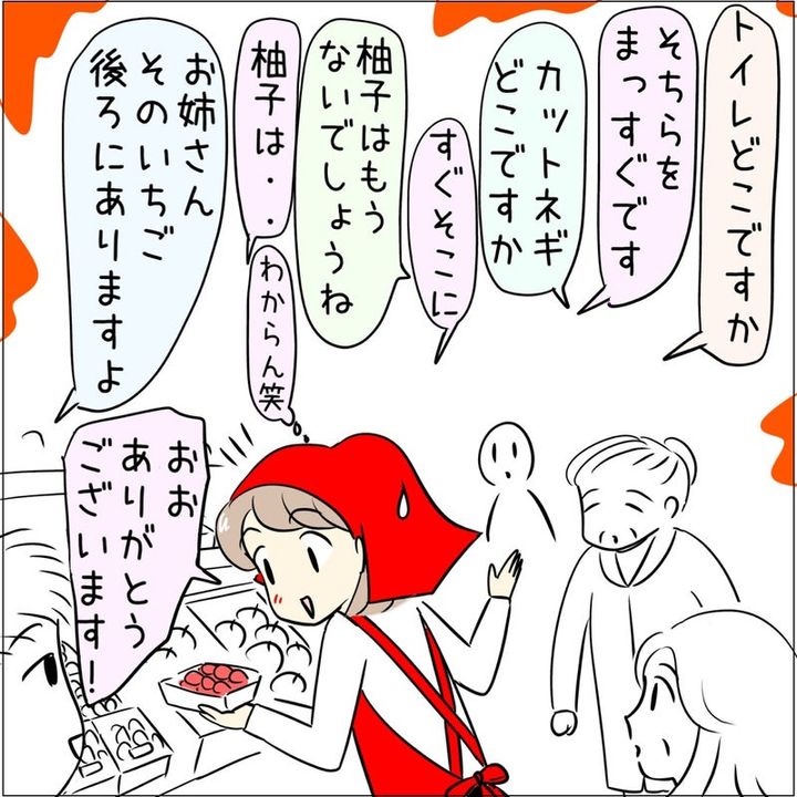 青果担当ではなくレジ担当のため答えられずにいると、次々に「トイレはどこ?」「カットネギは?」と質問攻めに。最終的には、探していた苺の売り場を逆にお客さんから教えてもらうことになったそうです。