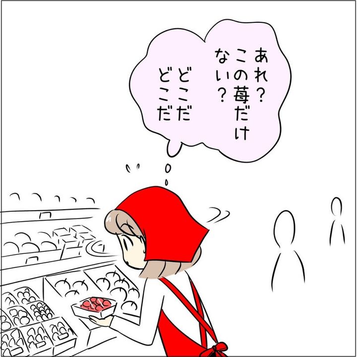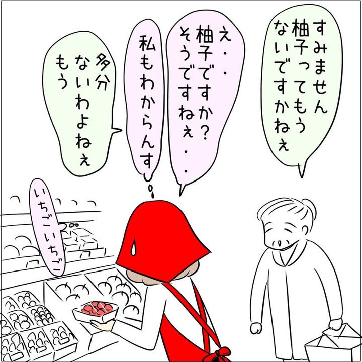 あとみさんは手が空いた隙に、苺の値段を確認するため売り場へ向かいました。しかし、同じ種類の苺が見当たらず探していると、別のお客さんから「柚子は売っていないか」と質問されます。