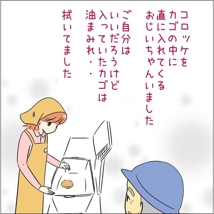スーパーの買い物カゴの中に、コロッケを直に入れているおじいさんがいたそう。衛生的に心配というだけでなく、カゴが油まみれという見た目も衝撃的な出来事だったのではないでしょうか。