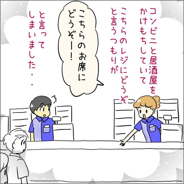 コンビニと居酒屋をかけもちしていると挨拶や口調が混ざってしまうのは自然なこと。「突き当たり」を「ぶち当たり」と言ってしまったり、病院で「またどうぞお越しくださいませ」と口にしてしまったりと、聞いている側も思わずクスッとしてしまう失敗ばかりです。