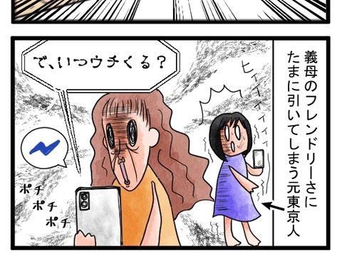 さらに義母は、帰り際にも「で、いつウチくる?」と畳みかけるように声をかけます。後日、知り合った女性からSNS申請が届きますが、共通の友達の欄にはすでに義母の姿が!サマ子さんはその積極性に圧倒されつつも、文化の違いを実感します。