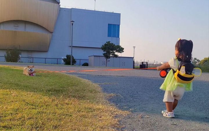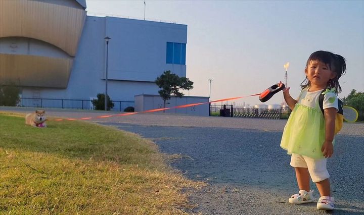 映像の奥、芝生に座っているのは、豆柴の『わらび』ちゃん。 そんなわらびちゃんを歩かせようとしているのでしょう、リードを引っ張っている女の子の姿もあります。
