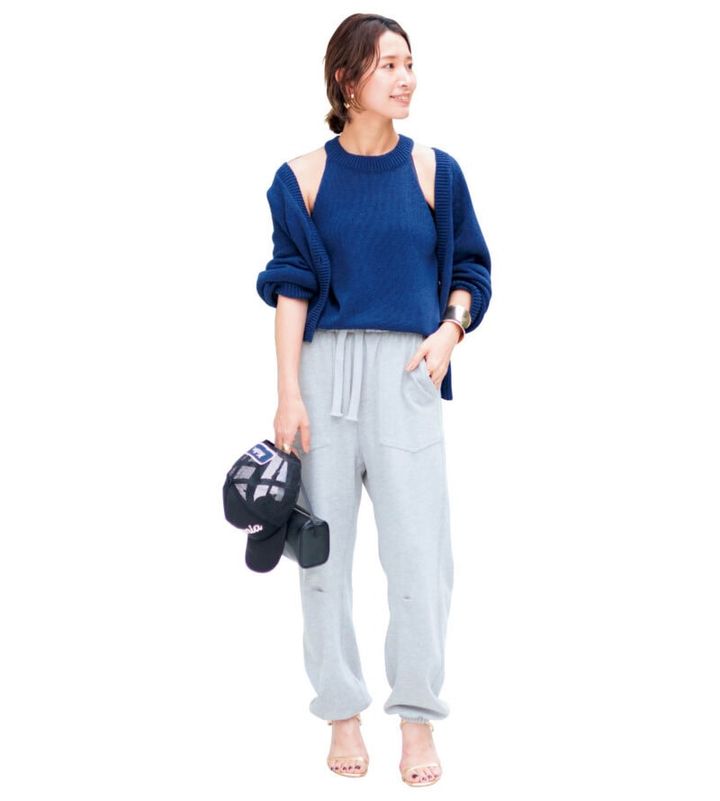 「ホルターネック型のノースリ一枚だと肌面積が広くなりすぎちゃうところを、同素材のカーデを重ねて奥行き&こなれ感を演出。スウェットパンツで程よくリラクシーな佇まいに」