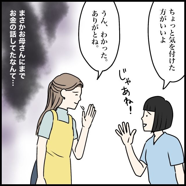 「ちょっと気をつけた方がいいよ。」と忠告してくれたミホに「うん、分かった。ありがとね」と伝えながら、心の中では、まさかお母さんにまでお金の話してたなんてと、どんよりしていました。